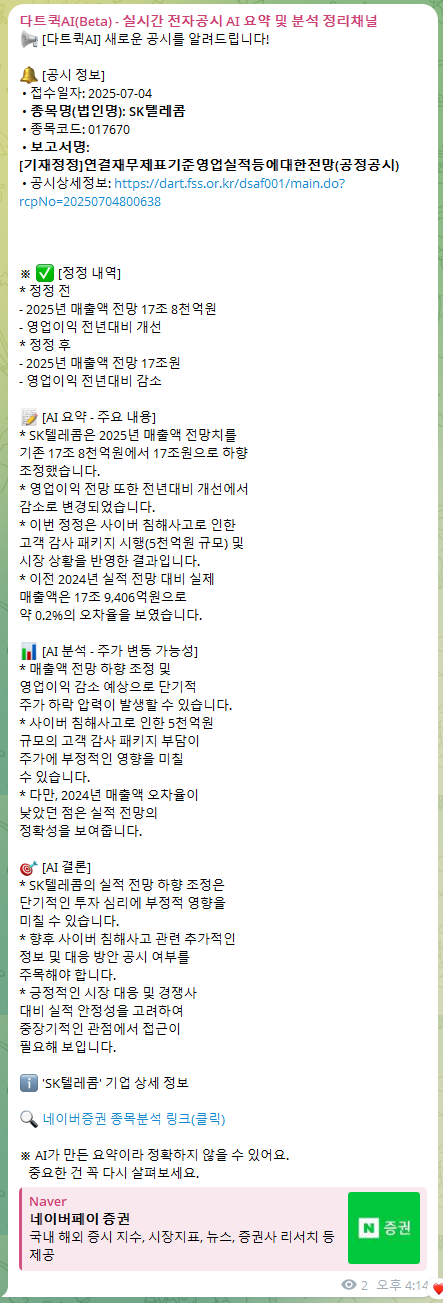'다트퀵AI' 실시간 주식공시 AI 요약 분석 텔레그램 채널은 절대 투자 권유를 하지 않습니다.