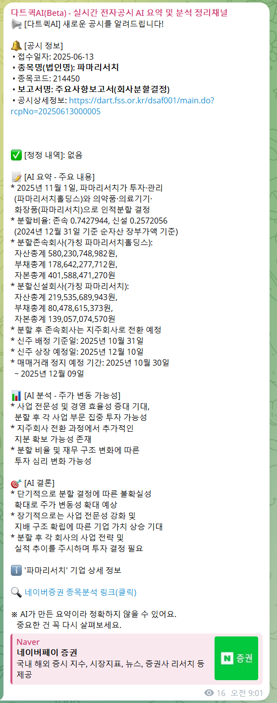📢 [다트퀵AI] 새로운 공시를 알려드립니다! 🔔 [공시 정보] • 접수일자: 2025-06-13 • 종목명(법인명): 파마리서치 • 종목코드: 214450 • 보고서명: 주요사항보고서(회사분할결정) • 공시상세정보: https://dart.fss.or.kr/dsaf001/main.do?rcpNo=20250613000005 ✅ [정정 내역]: 없음 📝 [AI 요약 - 주요 내용] * 2025년 11월 1일, 파마리서치가 투자·관리 (파마리서치홀딩스)와 의약품·의료기기· 화장품(파마리서치)으로 인적분할 결정 * 분할비율: 존속 ...