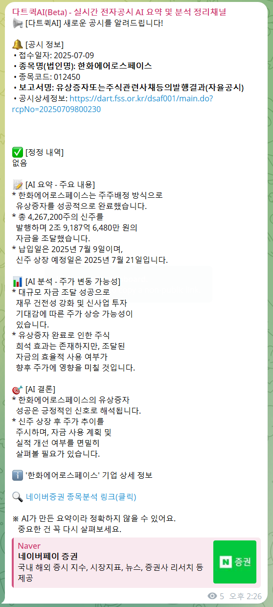 '다트퀵AI' 실시간 주식공시 AI 요약 분석 텔레그램 채널은 절대 투자 권유를 하지 않습니다.