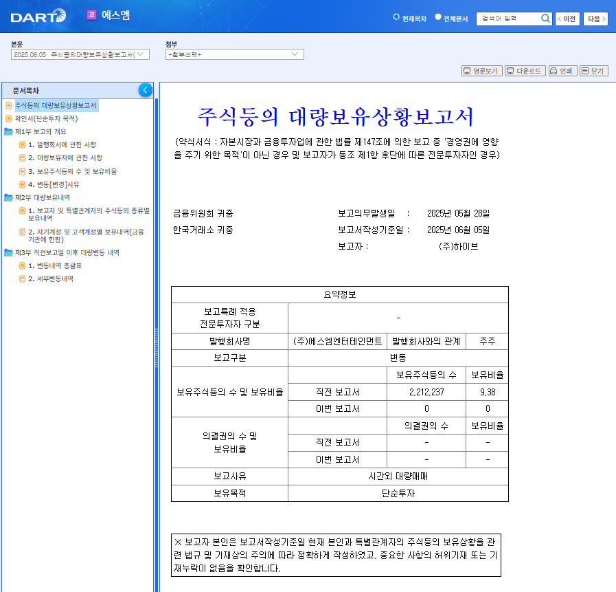 • 원본 공시 내용: (주)하이브가 (주)에스엠엔터테인먼트 주식 2,212,237주(9.38%)를 시간외 대량매매를 통해 전량 처분하여 보유비율이 0%가 되었음을 보고.